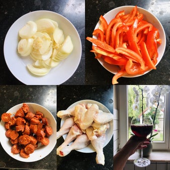 - Haal het vel van de chorizo af en snij in stukken van 1 cm