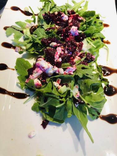 3. Kruid de rucola af met wat olijfolie peper en zout. Leg de rucola op een bord en bestrooi het geheel met de rode biet, feta en de gesneden pijpajuin (een deel bijhouden voor de afwerking).