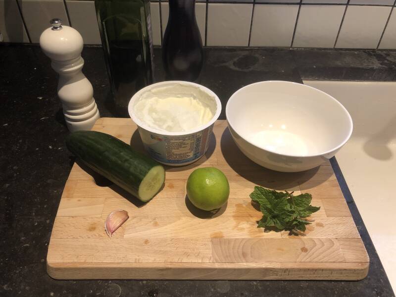 2. Snij de look heel fijn en meng deze samen met de komkommer en het limoensap door de yoghurt.